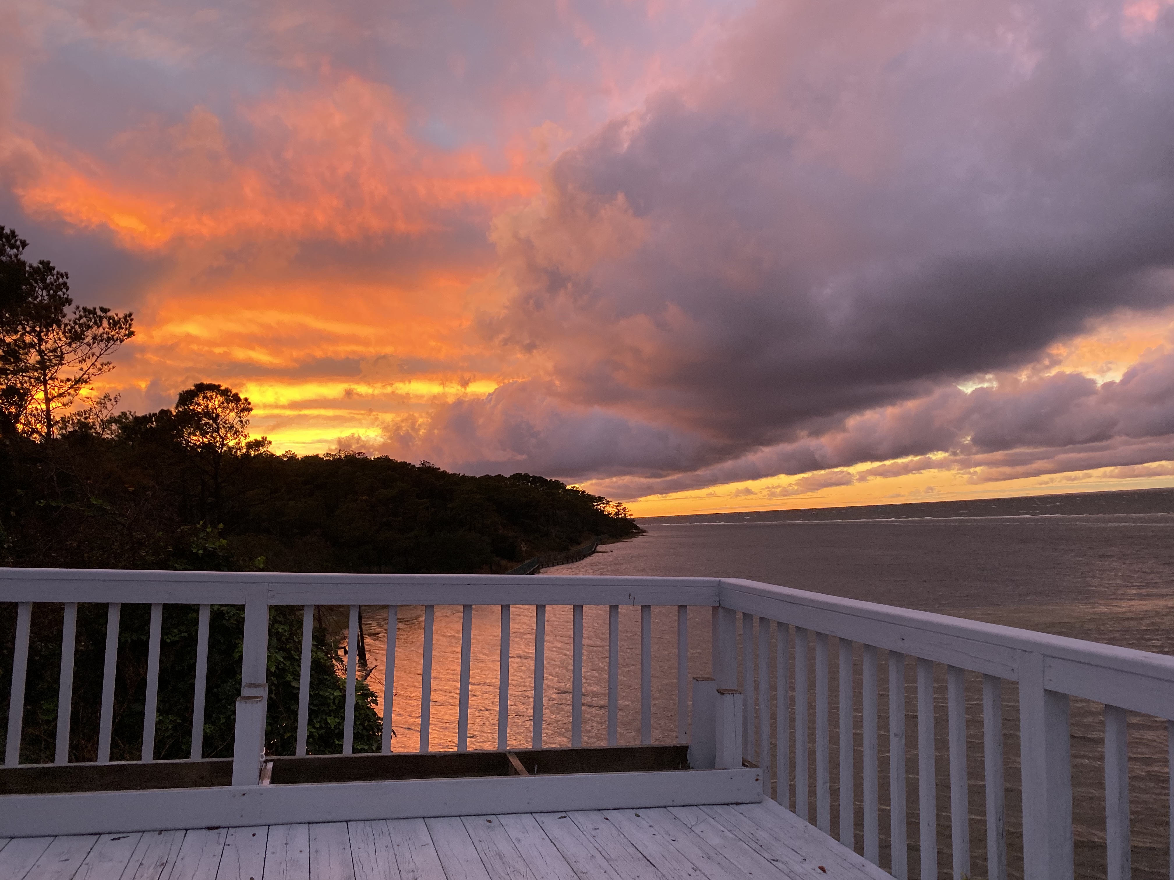 I definitely had a hard time sleeping. I looked at the clock, 1 am, 2:30 am, 3:15 am, 4:30 am, and finally 5:30 am. When I saw that time come up, I jumped up (ok, there was no jumping after having a tumor in my back), let’s rephrase that…..I slowly rolled out of bed, literally, and pushed my self up to a standing position to go outside to sit on my deck and watch the sun come up over the water. It was the most calming thing I could do at that time for the first couple of weeks. The upcoming weekend was a big one! My dad was coming to join my Mom to help with the big move and Rise and my sister/cousin, Debbie, was coming in. Ok, side story real quick….so Deb and I have lived on different coasts all of our lives. Heck, at one point she lived in Hawaii,. Could that be any farther from the Outer Banks of North Carolina? I think not! Growing up we spent every Thanksgiving together and alternated staying with each other for a week in the summer. We had matching everything-bathing suits, pajamas, you name it! I can still see the picture of us standing at her pool in Chicago with our new cool burgundy suits on. Her family had just moved to Florida to be closer to her parents and her new job flew her to places up and down the East Coast. This particular weekend, one of the biggest of my whole life, her job actually took her to Richmond, only three hours away. She rented a car and drove to the Outer Banks….never has this been a possibility for a visit before. God was loving on both of us!